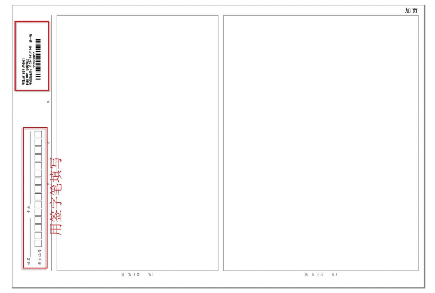 (5)如果使用了加页答题纸(超过4张),那么加页答题纸不用粘贴条形码,只须填写姓名、专业、考生编号,然后正常答题即可。