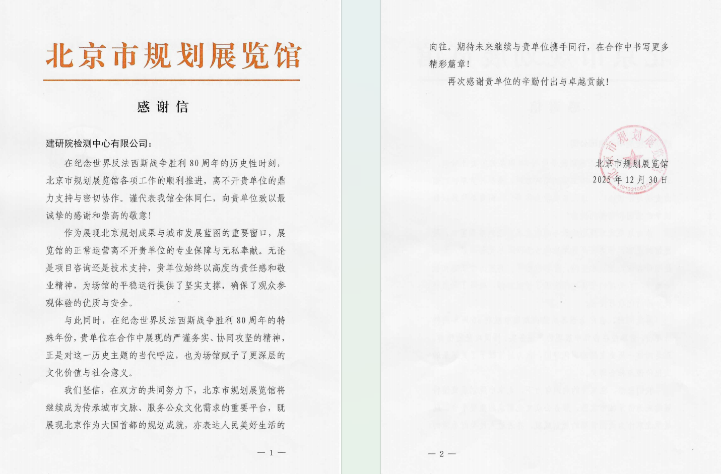 近日,北京市规划展览馆发来感谢信,对检测中心在纪念世界反法西斯战争胜利80周年的历史性时刻,给予北京市规划展览馆的鼎力支持和密切合作表示感谢。