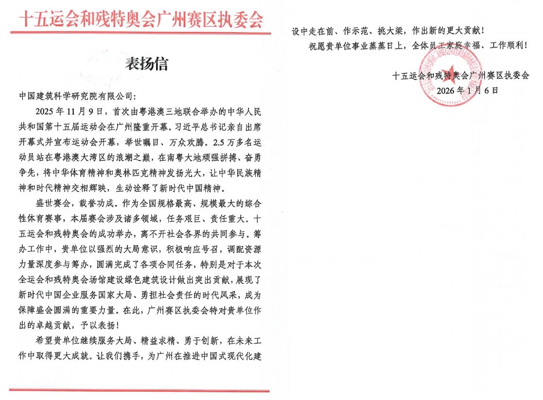 信中提到,十五运会和残特奥会作为全国规格最高、规模最大的综合性体育赛事,任务艰巨、责任重大,中国建研院以强烈的大局意识,积极响应号召,调配资源力量深度参与赛事筹办工作,圆满完成了各项合同任务,特别是在场馆的绿色低碳设计方面作出了突出贡献,展现了新时代中国企业服务国家大局、勇担社会责任的时代风采,成为保障盛会圆满的重要力量。广州赛区执委会对中国建研院的卓越贡献予以表扬,并期望未来继续携手,助力广州在推进中国式现代化建设进程中走在前列。